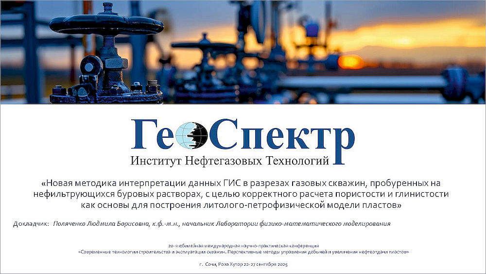 «Новая методика интерпретации данных ГИС в разрезах газовых скважин, пробуренных на нефильтрующихся буровых растворах, с целью корректного расчета пористости и глинистости как основы для построения литолого-петрофизической модели пластов» - докладчик Поляченко Л.Б. (начальник Лаборатории физико-математического моделирования).